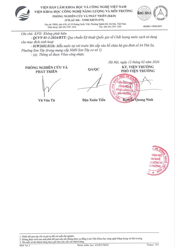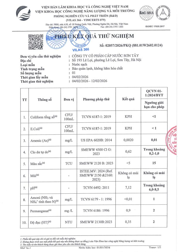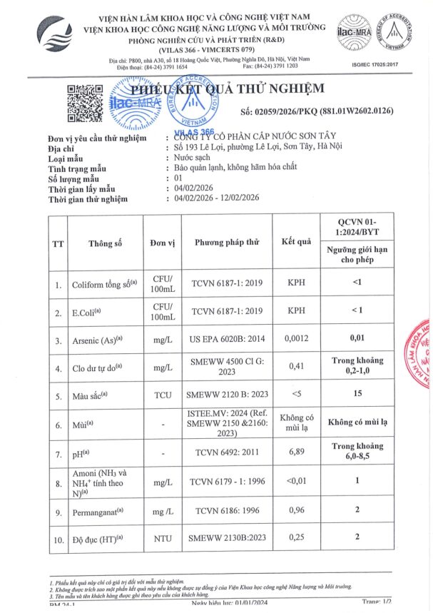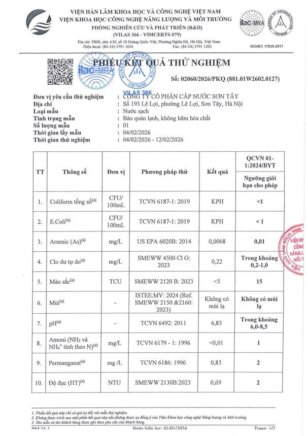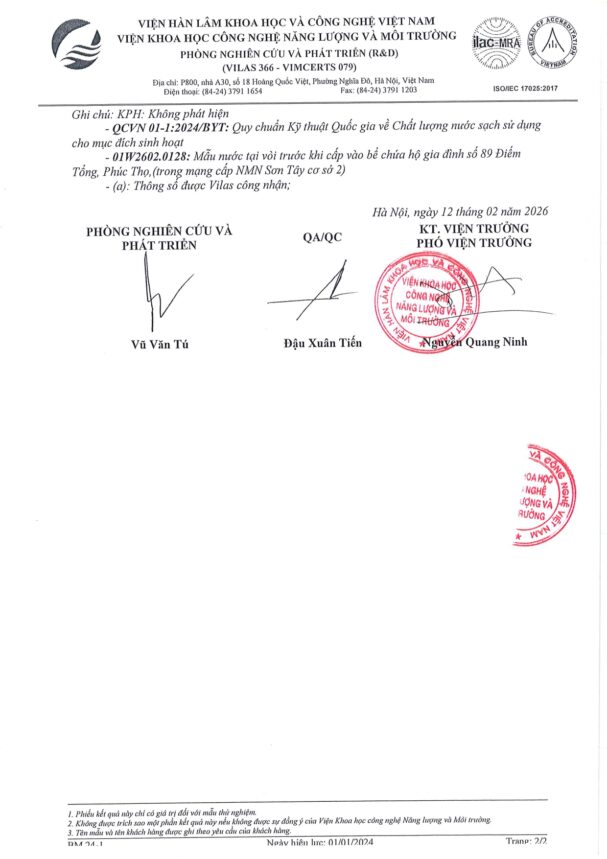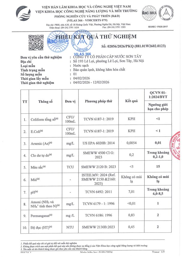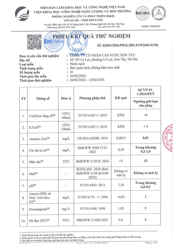 • Báo cáo xét nghiệm nước tháng 02 năm 2026