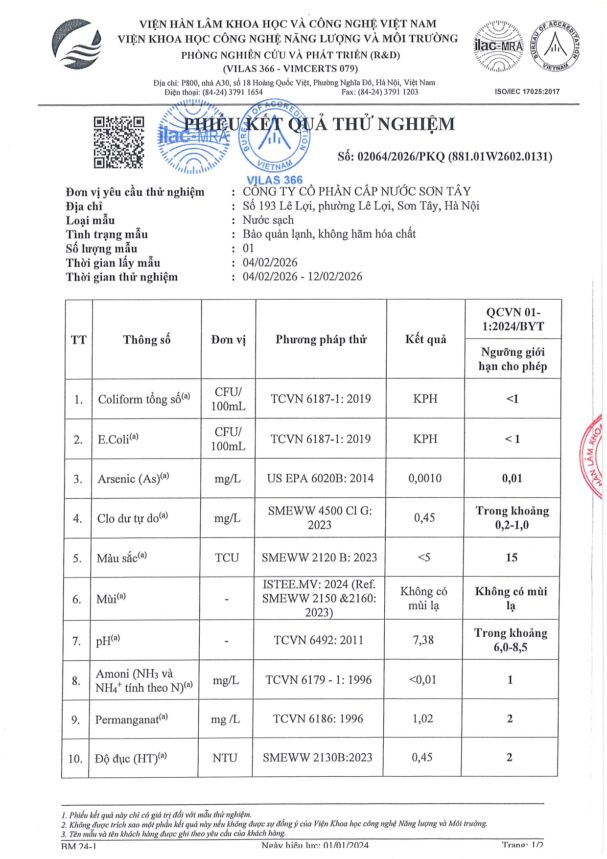 Báo cáo xét nghiệm nước tháng 02 năm 2026